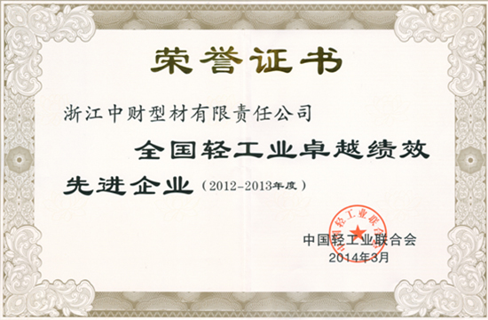 浙江乐鱼网页版登录入口型材获2012—2013年度全国轻工业卓越绩效先进企业